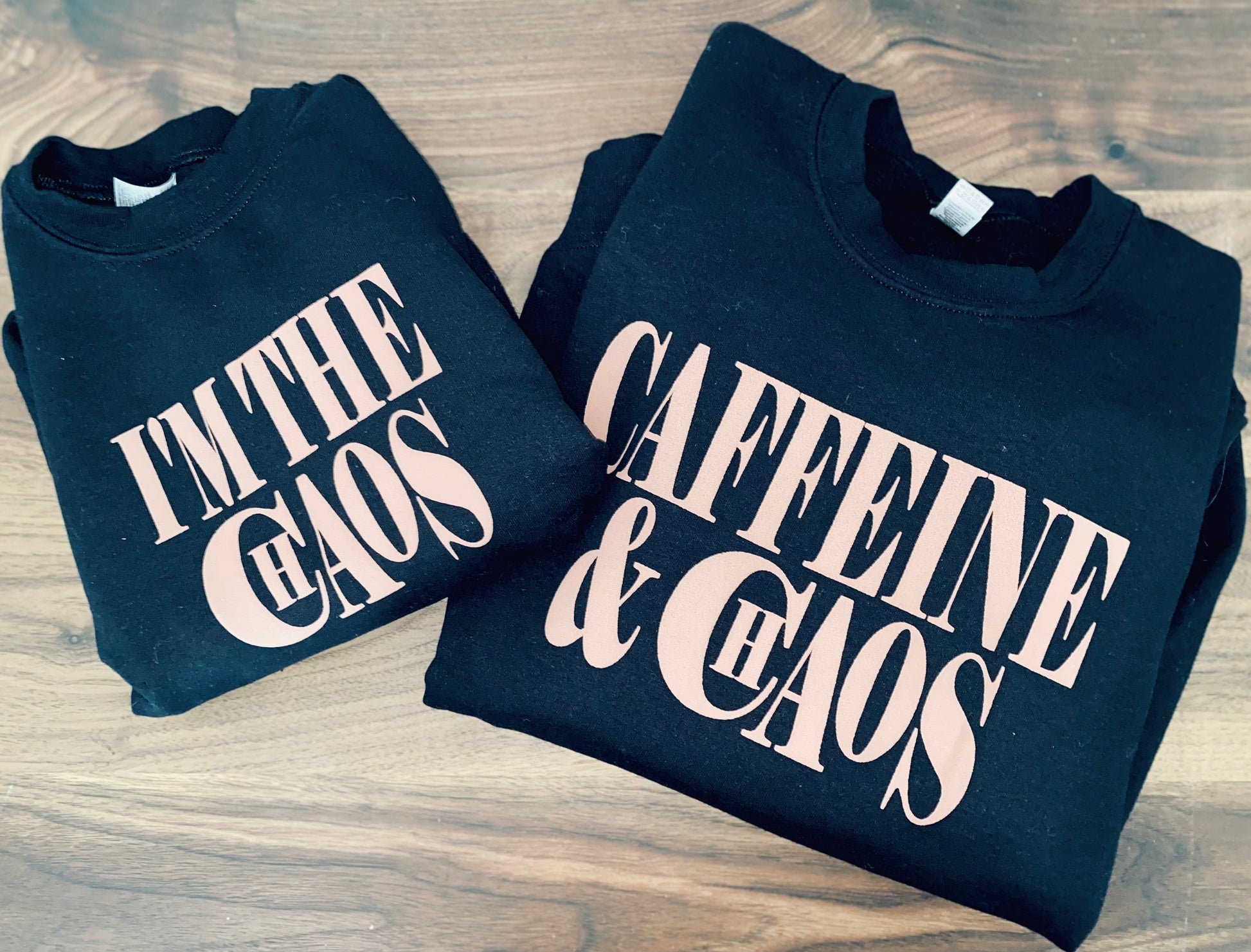 These Caffeine & Chaos (Me & Mini) Crewneck Sweatshirts are the perfect addition to your wardrobe!